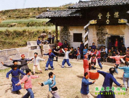 “茅古斯與擺手舞”是土家族紀(jì)念祖先開拓荒野、捕魚狩獵等創(chuàng)世業(yè)績(jī)的一種原始戲劇形式,被中外的戲劇界稱為是人類戲劇文化的“活化石”,茅古斯是土家族最古老的舞蹈,也是傳授狩獵技藝的民間武術(shù),體現(xiàn)土家族先民的生活情態(tài)。