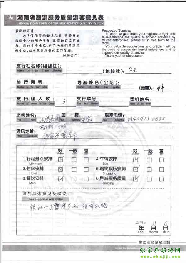 2010年11月6日江蘇楊小姐一行3位旅游質(zhì)量反饋:很細(xì)心,態(tài)度好,很有禮貌